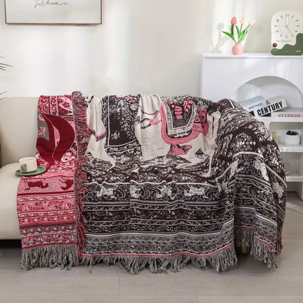 Featuring a stunning horse and rider print, it’s perfect for your sofa, bed, or as a cozy nap blanket. The soft cotton fabric ensures comfort throughout the year, while the intricate design and fringed edges add a stylish touch.