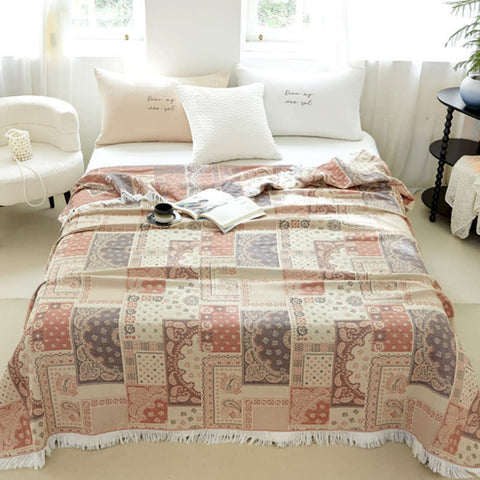 Bring a touch of timeless elegance to your space with this lightweight and breathable cotton gauze blanket. Featuring a stunning mosaic pattern and delicate tassels, it’s perfect for year-round comfort and style.